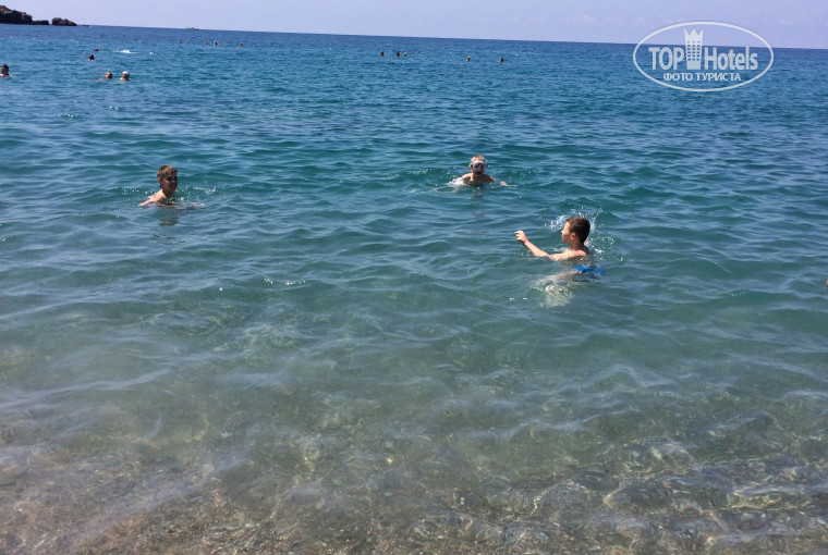 Здравствуйте!!!Спасибо Вам за прекрасный отдых!!!Отдыхали с друзьями и детьми с26 мая по 4 июня .Очень понравилось.Разместили нас через пару часов ,как приехали,в хорошие номера (как просили)Анимация хорошая ,ребята веселые ,каждый день участвовали в играх ,занимались фитнесом.Вечером каждый день детская дискотека ,после развлекали взрослых.С23.00 до 01.30 в клубе ночная дискотека ..По питанию - тоже нориканий нет .Выбор большой ,правда суп только по одному виду было .А ,минус всё-таки есть .Мороженое давали каждый день ровно в начало ужина 19.00 .Все дети бежали за мороженом ,а потом естественно их не накормишь.Все родители злились.Обычно мороженое в других отелях дают на полдник!...Пляжные полотенца в отели платные но мы не страдали по этому поводу .Взяли с собой,а так можно купить и при отели за 2&полотенец. Море каменистое ,очень чистое и прозрачное.Дети наши пищали ,что больно ходить по камням и мы ходили чуть дальше к последнему отелю ( идти 5мин )там очень мелкая галька ,детям нравилось там играть...Вообщем было все хорошо!Конечно если придераться то минусы можно найти везде.Мы отдыхали весело ,хорошо и минусов не искали.Обязательно приедем ещё раз в этот отель!