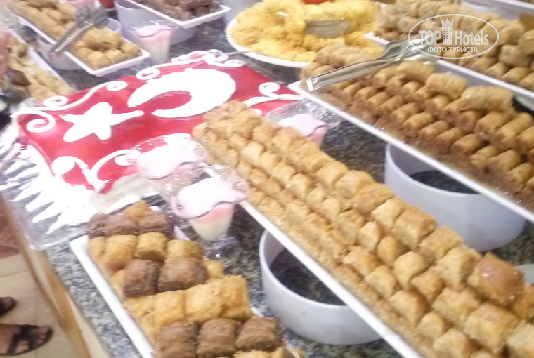 Хочу оставить свой отзыв о нашем отдыхе в этом отеле. Мы прилетели в Анталию, 2 часа ехали до отеля. Вообще такая красота за окном, что даже не почувствовала как пролетело время. В отеле нас встретили на рецепшне с улыбкой. Внутри всё со вкусом. Мы оставили вещи в холле и пошли завтракать. Первое впечатление - великолепное. Всего много, всё вкусно. У нас было 2 номера, сначала нам дали один номер, и мы сгрузив все вещи отправились... на море. Номера уютные, всё необходимое имеется(двухспальная кровать, кресло, стол, кондиционер, телевизор, балкон со стульями и столиком, шкаф с плечиками, в ванной комнате есть фен. Но возьмите с собой шампунь. Первая линия - это прекрасно))) А теперь, по-порядку: питание, просто отличное: на завтрак - блинчики, яйца вареные, омлет, йогурт (5видов), сухие завтраки, овощи, фрукты консервированные, варенье (6-8 видов), и даже суп и много ещё другого. Обед :салаты, мясо, рыба, картошка, рис, овощи тушеные, на гриле и так далее и тому подобное. Ужин, тут даже нельзя всё перечислить: форель жареная, на гриле, а ещё давали соленую рыбу (сами засаливают), курица тушеная, ножки на гриле, люля -кебаб из баранины. Ну очень всё вкусно))) Да, есть очереди, но лично меня это не беспокоило. Еды хватало всем. Отель заселен полностью, людей много, в основном с Украины, России и Беларуссии, что уже говорит контингенте. Фрукты :были яблоки, черешня, клубника, мандарины, сливы, арбузы. Сладости очень вкусные, особенно пахлова) Мы даже не смогли всё попробовать. Вот чего не хватает в столовой, так это рукомойника. Но не критично.