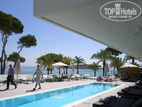 - Общественный песчаный пляж в нескольких метрах, лежак и зонт по 35 евро за каждый.