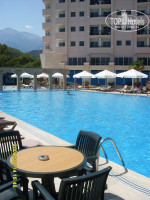 Отдыхали с 11.08.09 по 18.08.09. В целом очень хорошее впечатление.Территория очень ухоженная травку и кустики всякие стригут every day, маловато пальм,конечно,но все равно очень миленькая территория. Главное здание (в котором собственно и проживали) в довольо приличном состоянии, номера хорошие, уборку и смену полотенец провдили каждый день без напоминаний, табличек на ручке двери и чаевых. По поводу второго здания ничего сказать не могу внешне очень симпатичный, увитый плющем, вокруг него кустати гораздо больше зелени, чем у главного. Почитав отзывы почему то решили что жить будем обязательно в главном здании, по приезде пытались запихнуть в Anex, но 50$ на ресепшене делают свое дело и вот пожалуйста номер с видом на море. Питание ни плохое и ни хорошее, я бы сказала немного однообразное. В принципе ассортимент блюд в некоторые дни мог быть бы и разнообразнее. Соки из машинок соками назвала бы с большой натяжкой, вино разбавлено капитально. Режим питания был UAI (подразумевал под собой кроме всего прочего 6 иностранных алкогольных напитков, которые оказались местными аналогами) не оправдал себя, немногочисленные иностраннцы оказались умнее тип питания у них AI, о чем говорили оранжевые браслетики. Короче разницы между UAI и AI не обнаружила. Шампанское лучше не пить это просто гадость. О коктелях у барменов имеется свое представление, налить могут в стакан все что угодно, но получается как ни странно довольно вкусно. Проблем со столами за завтраком обедом и ужином нет. POOL bar работает с 10.00 до 24.00, Лоби бар - круглосуточно ( но очень медленные бармены).еще есть закуски в Snack bar с 12.30 до 16.00, который по вечером (кроме среды) превращается в ресторан A'la Carte (итальянский -вторник пятница воскресенье; рыбный-понедельник, четверг, суббота) по предварительной резервации на следующий день. Для любителей поиграть в саранчу ближе к полуночи есть ночной буфет в рестаране с 23.00-23.30. По средам турецкая ночь, в пятницу живая музыка. Все очень приветливые милые люди, улыбаются в 32 зуба. Дети при деле днем кормят рыб, вечером отплясывают с аниматором под одну и ту же музыку. Анимация плохая, но аниматоры красивые. дискотека номинально присутствует, но кроме скучающего DJ и аниматоров там никого нет. Есть кальянчик, очень милый мальчик предложит вам покурить его всего за 10$. Теперь про пляж лежаки занимать приходилось с утра в день заезда, придя на пляж 10 часов свободных уже не оказалось. Впредь были умнее, хотя через пару дней народ как-то схлынул и проблем с лежаками у моря не было, чего не скажешь про бассейн, с 7 часов свободных лежаков уже нет, людей на них в это время вобщем то тоже нет но вещи уже побросали. Море очень очень очень чистое около пирса плавают рыбы что лично мне было не очень приятно (прикормили аниматоры). Пляж меленькая галька, чистый . Вход в море хороший. Позади отеля великолепный вид на горы особенно хорошо видно из моря когда не скрыты дымкой что бывает не часто. На горах растут сосны, очень красиво воздух супер. Карты телефонные дешевле покупать у местных торговцев, а не в отеле и не у гидов.
