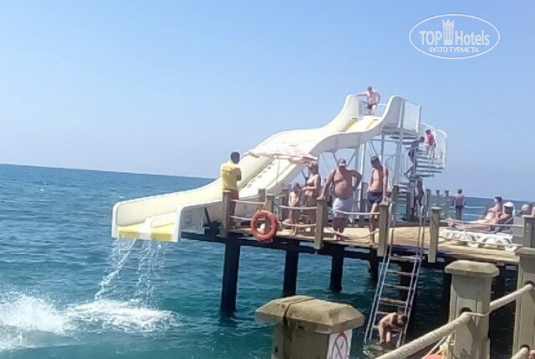 Пляж. На пляже песок перемешан с галькой, вход в море из мелкой гальки. С утра песок чистый, к вечеру после наплыва народа - не очень. Море чистое, теплое, частенько бывали большие волны, если повезет не попасться на глаза спасателям, то можно «покачаться» на волнах, а так не пускают далеко заплывать. На территории пляжа есть пирс, с него можно скатиться на водной горке прямо в море, классные ощущения! На территории отеля есть несколько бассейнов: большой с горками и анимацией, поменьше - тихий релакс бассейн, детский басик и крытый с холодной водой возле сауны. Шезлонгов как на пляже, так и возле бассейнов много, и с зонтами и без, но с каждым днем все больше людей заражались дурацкой идеей занять на весь день как можно больше лежаков - и возле пляжа, и на пирсе, и возле бассейнов. Мы каким-то чудом всегда находили себе хорошее местечко, но не занимали на весь день, считаю это дурным тоном.