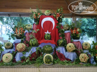 Ресторан. Еда была очень вкусной и разнообразной: разные сыры, овощи, салаты, выпечка, торты, турецкие сладости, из фруктов мы брали арбуз, дыню, черешню и клубнику, из мяса понравилась индейка и очень нежная телятина гриль, также много рыбы, блюд из курицы, разных гарниров… мы с мужем так все и не перепробовали. Еда никогда не заканчивалась, заботливые турки её всегда докладывают. Кроме главного ресторана можно перекусить еще в нескольких местах: в баре возле большого бассейна, в баре возле пляжа, в баре возле релакс бассейна, где расположены 2 ресторана а-ля карт. В Османский ресторан а-ля карт записывались через терминал возле рецепции, порции огромные, всё очень вкусно. На территории повсюду стоят холодильники с прохладительными напитками и водой, очень понравился айран, и соки тоже вкусные. Напитки как алкогольные, так и безалкогольные подают во всех барах и ресторанах. Мы пробовали вино (мне понравилось белое) пиво и несколько видов коктейлей.
