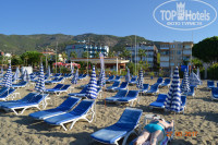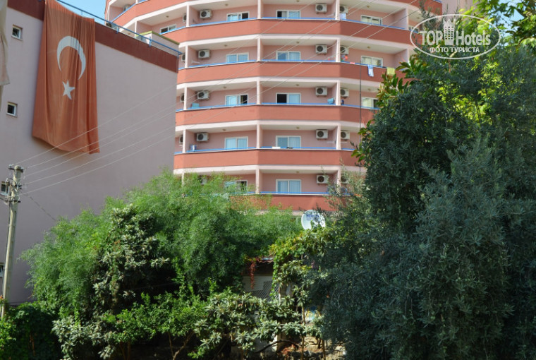 Добрый день!Отдыхали в отели в конце августа.Размещение без задержек. Ресепшн ,информация-нем.,анг., русский язык на 3-----. Номер-холодильник,ТВ,кондиционер.все О.К.Мыло,шампунь в дозаторах.Питание для 4* отличное-мясо,рыба,конд. изд,сушенный инжир,курага,лукум,фрукты.Приличное пиво.До пляжа 15 мин.,не утомительно,так же курсирует транспорт .Пляж песчаный,но при входе положена плита,что бы не вымывало песок.Море более спокойнее,чем за горой с крепостью.На пляже есть бар(с10-17.30),туалет,душ,раздевалка-бесплатно,а зонтики и шезлонги 5$. При выходе с отеля,прокат электро-скутеров(права не нужны) 5евро в час.Кто желает быстро подняться к крепости, по набережной ближе к горе есть фуникулер -20 тур.лир взрослый и10 т.лир детский билет в оба конца,рядом пещера Дамлаташ-19тур.лир.Отдыхом остались довольны,в этот отель обязательно вернемся снова.Спасибо.