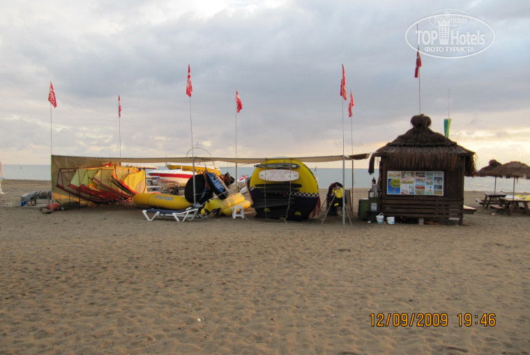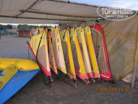 На станции встречают доброжелательно. Есть русскоговорящий персонал. Познакомился с общительным инструктором по виндсерфингу Фаидом, уроженцем Узбекистана. Один из парусов (6.5 м) принадлежал ему и поэтому был недоступен для проката. Всего было (видно на фото) 7 парусов от 2.5 до 5 м. Единственный 5-метровый парус часто был