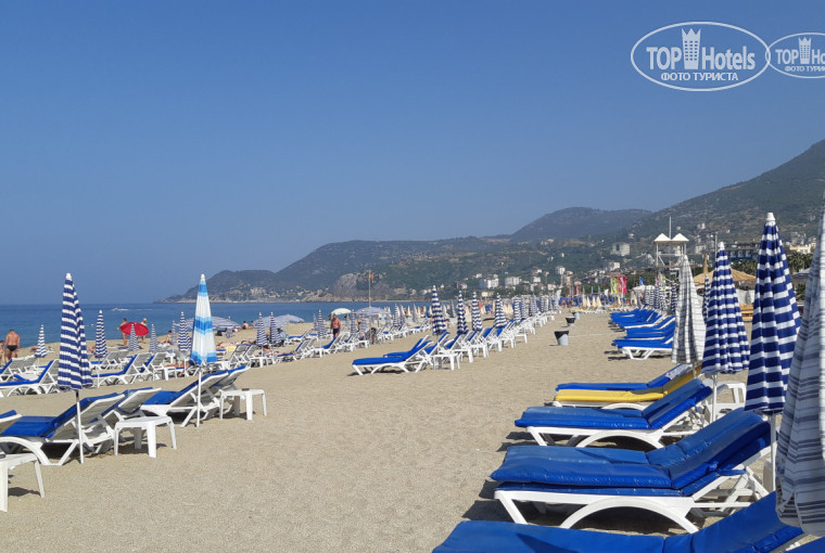 Отель находится в 100 метрах от пляжа Клеопатры который муниципальный и везде на нем платные лежаки. В отеле можно и нужно купить тикет со скидкой на лежаки и зонтик. Чем больше дней тем больше скидка. Тикеты продает дядя , сидящий слева от входа в отель (до 12:00) потом его можно найти на пляже. У отеля заключен договор с пляжем No12.