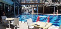 бассейн есть достаточно большой. Видели как играют в водное поло. Но мы не любители хлора. В отеле есть терраса - выход на нее из лобби там можно покурить кальян и просто расслабиться. Wifi ловит хорошо а лобби иногда добиваети до номеров. Есть маленький детский клуб но было ли там что-нибудь днем я не знаю - были на пляже. Вечером мини диско. 3 дня из 6 была анимация в остальные дни только музыка после мини диско. Кому это принципиально. Но в Алании есть чем заняться и днем и ночью!