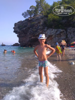 Море!море обалденное, чистое. пешком минут 5-7 идти.лежаки всегда свободны в 8 утра (мы приходили в это время). лучше купить спец.обувь (мы хоть и не неженки, но так было комфортнее гораздо).на дикий пляж тоже ездили, да там, конечно, красиво, но одного раза было достаточно,пофотографироваться,поплавать. наш пляж не хуже, а заход на диком гораздо круче почти сразу. и пешком туда идти достаточно долго, с детьми вообще не советую.