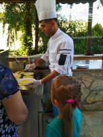 На завтрак всегда было горячее и йогурт/молоко с хлопьями, мед, джем, хлеб, рогалики. На обед и ужин: горячее 4х видов, шведский стол с салатами, миски с овощами и зеленью, сладкое: бисквитный торт и мучные сладости. На завтрак и ужин на террасе готовили при нас.