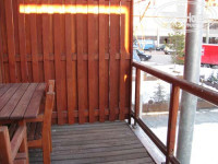 Вид из номеров на площадь и склоны, балконы обшиты деревом.