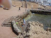 Приехали в отель утром и в 9-20 нас уже заселили в номер, покормили, все рассказали. В первый день нельзя выходить из отеля, т.к. у вас нет еще регистрации. Утром следующего дня обязательная встреча с гидом ( надо идти-это точно) Эта встреча не бесполезна, хотя отняла час времени. Жили в основном корпусе, потому что трехместные номера здесь, а двухместные в в маленьких домиках. Номера везде одинаковые и очень комфортные. Нам повезло с номером: вид из окна был шикарный: горы, пальмы и....дорога с машинами.Но это фигня. Каждое утро, открывая шторы, ты видишь супер картину, и улыбка раздвигается , как шторы!. Бассейны отличные, удобные. Аниматоры отличные, веселые. Музыка приятная, но иногда громковато. Питание -нет слов! все, что хочешь: говядина, курица, рыба разная, индейка, которая там почему-то называется турция, цыплята, об овощах и речи нет, фрукты: арбуз, дыня, виноград, финики. На завтрак йогурты, творог с разными добавками, выпечка. Кофе нескафе сами себе готовите., молоко есть.Короче все отлично с едой. Главный минус -это море. Я в Шарме третий раз, но это море только для хорошо плавающих. С пирса сразу 30метров глубины, ступеньки выщербленные, опасные, штормит всегда. С берега не войти, камни и штормит, но если войти удалось (только в тапках для кораллов), то получите удовольствие, наблюдая за рыбками. Лечь нельзя, собьете колени. Без тапок нельзя: в первый день рискнула и получила 2 травмы: еж пробил ногу и оцарапалась о коралл, все болело 4 дня. Короче с детьми сюда нельзя никак! Да , до моря идти 8 минут по жаре, часть пути с горы и в гору (натренируетесь отлично). От отеля бесплатно предлагают 2 экскурсии: на Наама бей и в Сохо с 18-00 до 20-00 и привозят к ужину (записаться на рецепшн утром).