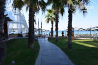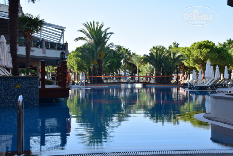 Небольшая, но грамотно спланированная, нет скученности людей. Имеется два бассейна, аквапарк, сад, зона для тех, кто прилетел и ждет номера (можно отдохнуть в помещении на диванах с телевизором и душем). Лежаков хватает в любое время. Имеются мягкие круглые лежаки на релакс бассейне, которые также доступны без "раннего бронирования". Бары разбросаны по территории, на некоторых даже и не бывал. Только в Папиллоне видел столы для игры в настольный теннис и футбольные настольные автоматы (очень интересная задумка). Количество туалетов по территории отеля достаточное, всегда чистые, единственный недостаток одного из них-излишнее охлаждение (заходишь мокрый с моря или бассейна как в холодильник).