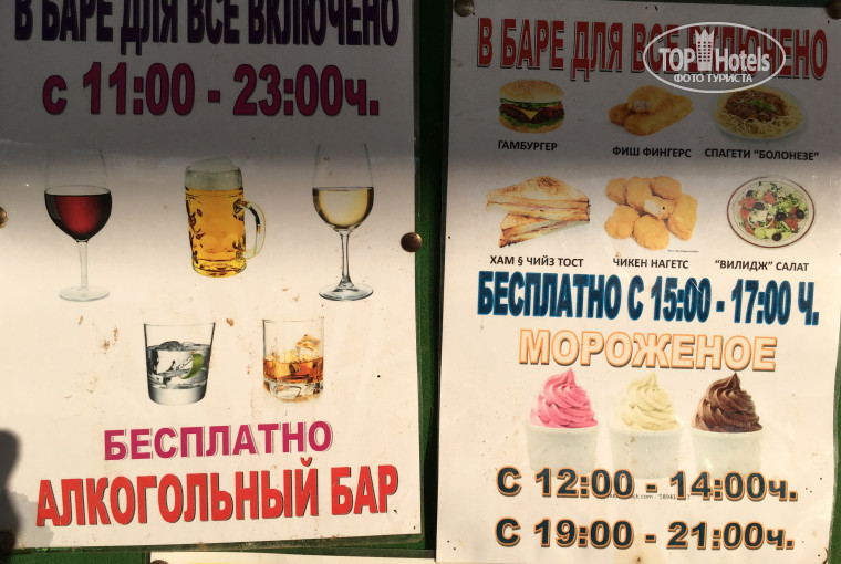 Про бар. В баре с 11 до 23 дают бесплатно те же соки, что и на завтраке, воду, пиво, вино белое-красное, водка, ром и несколько коктейлей. Более вычурные коктейли и прочие напитки в среднем за 3 евро.