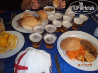 обеды ужины добавляется курица или рыба или печень или мясо порционно. очереди огромные, но проходят быстро. под конец некоторые популярные блюда не пополняют, например огурцы в сметанном соусе. все ооочень просто и без изысков. в общем еда так, чтоб накормить людей и они не умерли с голоду, но она есть и в принципе ее достаточно. удовольствия не получите точно. алкоголь. тоже не фонтан, хотя люди пьют, мы тоже пили, не умерли, но если можете позволить-лучше берите свой. пиво только в обед и ужин в столовой из бутылок или банок. по 2 стаканчика в руки. иногда можно выпросить 4. бутылка пива как раз разливается на 4 стаканчика. другой алкоголь, газировки и юпи тоже есть в столовой. цветные напитки-редкая химоза. тут уже честно скажу-такой гадости еще не пробовал, хоть и во всех отелях в основном эти юпи, но здесь они особенно пахнущие пластмассой. газировки хорошие...в общем к столовой потом можно привыкнуть и научиться правильно ею пользоваться.