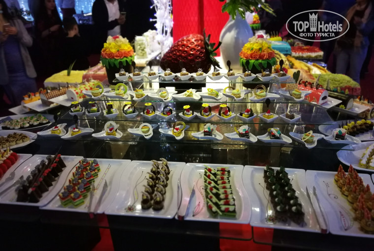 Доброго времени суток! Начну по порядку. Прилетели мы в 8 утра, попросили ждать, пока освободится номер. Заселили ближе к 10 утра, предлагали выбрать номер, но читая ранние отзывы, решили испытать судьбу))))) и не проплачивать выбор комнаты. И нам очень повезло. Заселили нас в 8 корпусе, напротив главного наго бара, ресторана. Браслеты одели только в 10.30, соответственно, покушать нам не удалось. Предложили перекусить у бара с 11 часов, но там произошла заминка. Итог: дождались обеда. Первое впечатление было испорчено видом лобби. Это просто какая то катастрофа!!! Старая мебель, вся в отпечатках. Да и само помещение очень маленькое. Я подумала: все.... Злая, голодная))) Но как только вы выходите из лобби, впечатление меняется. Очень красивая и ухоженная территория, вся в цветах и зелени. Большой аквапарк, грамотное размещение корпусов. На територии есть спа, аптека(в основном предметы гигиены и их масла, причем по приемлемым ценам), парикмахерская. По периметру отеля магазинчики с сувенирами. Цены приемлимые, по крайней мере, не сильно отличались от цен в городе. Далее.... Номер: стандартный номер, большая кровать и раскладушка. Есть чайник, фен. Все работало,номер относительно был чист)))) уборка была положена каждый день, но мы иногда от нее отказывались, по тому что, она заключалась в за правления кровати, выноса мусора, смены полотенец и замены моющих средств. То есть, как шторы были оборваны в начале, так мы с ними и уехали))) шкаф был весь в отпечатках. Вообще нужно иметь ввиду, что убираться они не умеют. Отелю не хватает женской руки. Такая же ситуация и в главном ресторане. Вроде убираются, вроде бы чисто, но хочется все переделать) По питанию:все было вкусно, много. Еда разнообразна:курица, говядина, баранина рыба каждый день в различном приготовлении. Гарниры тоже разнообразны, т. е. Если вы соблюдаете диету, сложностей у вас не возникнет. Фрукты сезонные. Отдельное спасибо кондитерам! Они просто волшебники, я такой красоты нигде не видела. Не ем сладкого- пришлось))) перепробовала все))) не поправилась)))) из минусов- чай только черный, пластиковые стаканы, отсутствие чайных ложек. Может для кого то это не важно, но для 5 * совсем не дотягивает. Очень жаль, что нельзя было выходить покушать на улицу, только в помещении. Бары: алкоголь оценивать не буду, все как везде. Напитки тоже, иногда были что то вроде фрешей со льдом. Бармены просто молодцы, доброжелательны, вежливы и учтивы. Анимация: очень слаба. Хотя парни оч круто танцуют. СПА: не плохо. Торгуйтесь, завышают цены. Если пойдете на массаж, то по рекомендую Хабибу. А вообще хочу сказать, что отдых- это хорошая компания. И нам очень повезло! Мы познакомились с замечательными людьми из разных стран. Весело проводили время, что не важно нам было, убирались у нас или нет)))) ВСЕМ ОГРОМНЫЙ ПРИВЕТ! Море. Мы знали куда едем и 2 береговая для нас не проблема. Спокойно ходили пешком. Каждые 30 мин курсировал автобус. 170 м рифа, а потом резкая глубина. Очень красиво, много рыб. Минус- один пирс. Когда очень много людей, выстраивалась очередь. Новогодня ночь: все красиво приготовлено, оформлено, но очень мало времени. В 2 часа ночи все закончилось. для нашего русского менталитета, в 2 только все начинается.. Столы начали убирать уже к 12 часам, пришлось сражаться до последнего за стол))) Кто планирует банкеты во время отдыха, запасайте