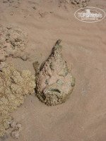В один из дней не было ветров и был сильный отлив. Многие кораллы были совсем без воды, и мы гуляли между ними. И вдруг я заметил странную и довольно уродливую рыбу. Судя по ее форме, она была донной. Она лежала на песке без воды, и по ее виду было понятно, что ей хреново.