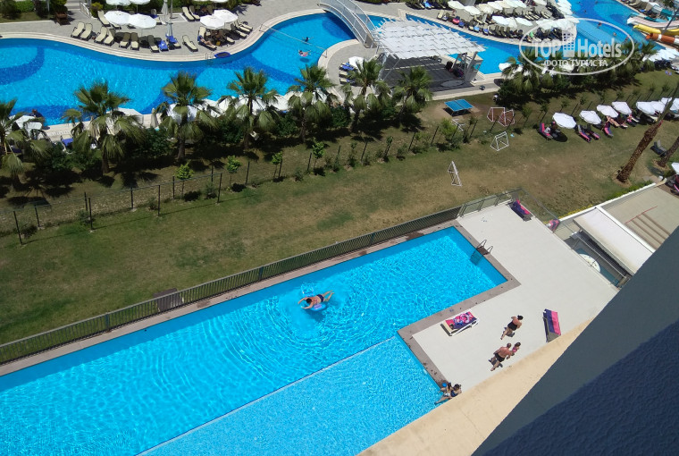 В отеле были около 8 вечера, пока готовили номер любезно предложили по-ужинать, предварительно надев браслеты. В Турции мы частые гости, на протяжении последних пяти лет летаем ежегодно, были готовы к занимательной игре на ресепшн по-выклянчиванию небольшого или большого вознаграждения за хороший вид из номера. Но в этом году случилось чудо и нам дали отличный номер на 6 этаже с видом на Жадор, были наслышаны про номера с видом на Порт-Ривер, поэтому взяли номер с видом на бассейн изначально.