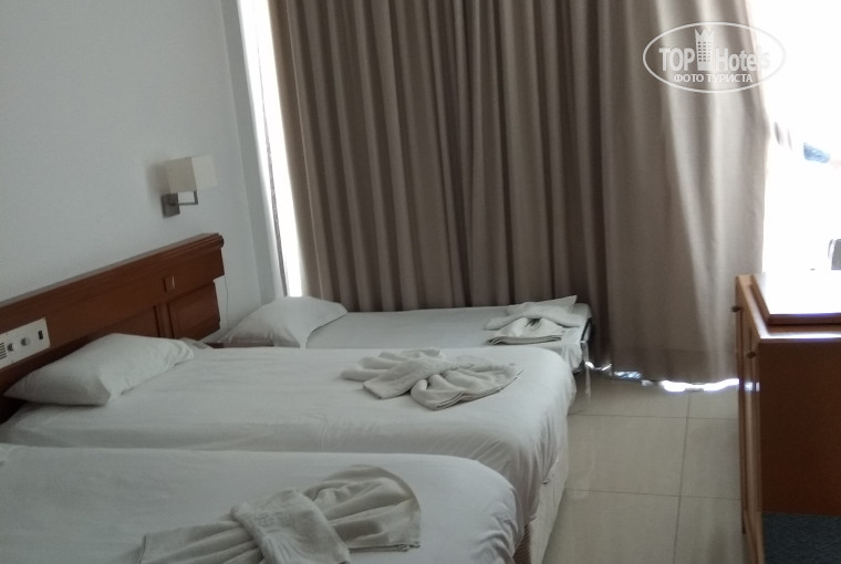 Отдыхали в этом отеле с ребенком 3 лет. Брали номер sea side std. Приехали в отель около часа дня, нас оформили и сразу выдали ключ от номера, что очень порадовало (не ждали до 14.00). Номер дали на 1 этаже, с большой террасой, но потрёпанный временем. Новые номера в другом корпусе. Музыку слышно с номере, т.к.почти под балконом стояла сцена. После первой ночи попросили поменять номер, но отель под завязку был забит. Нам пообещали как только, что то освободится нас предупредят. Ну мы и поняли, что в данном номере будем до конца. В отеле происходит овербукинг, под конец отдыха часто видели как часть приезжих туристов селили в соседний отель Одесса.