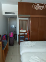 Сам номер небольшой, кровать двухспальная (из двух кроватей) и доп.кровать для ребенка. Есть набор для приготовления кофе и чая. Пополняемый. Есть холодильник, но он тоже выключается стоит выйти из номера. Поэтому он постоянно подтекал. Странно почему не сделать так, чтобы холодильник работал постоянно. Сейф платный. Wi fi за 7 дней 24 евро на 2 устройства. Либо 10 евро за день. Работает вполне сносно и в номере и на территории отеля.