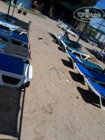 Пляж грязный с окурками и мусором. Многие лежаки сломаны, их мало.