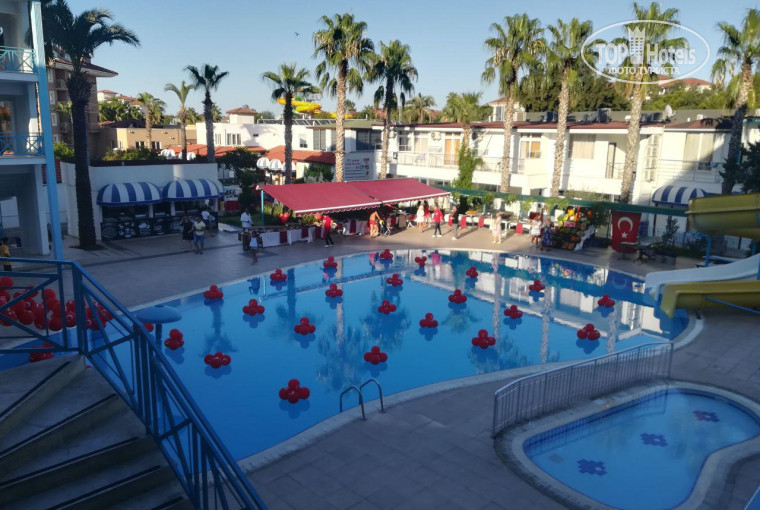 Территория: небольшая, есть два бассейна, ресторан-столовая, на втором этаже полноценный бар, большая сцена.