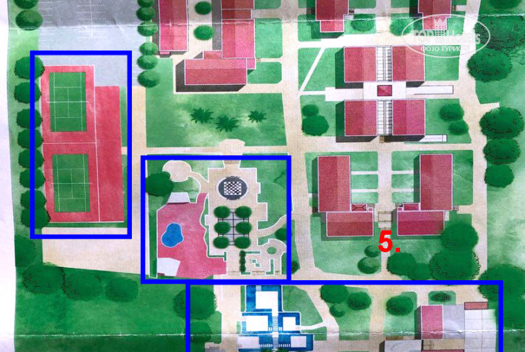 Отель не расположен у моря – перпендикулярно к нему, под небольшим наклоном к береговой линии. Поэтому Sea View (кому нужно) там условный и только в Suit на самом верхнем этаже (см. карту № 5). Если вы едете с ребенком, то будете рассматривать вариант с двумя комнатами. При прямом резерве номера Family Deluxe и следующей категории Suite стоили примерно одинаково, в случае путевки – ценник на Family Deluxe значительно ниже. Но обращаю ваше внимание, что данные номера расположены в корпусах (см. карту № 2, 3). Это следующий корпус после корпуса с Эконом номерами (Eco) и Ресепшена (см. карту № 2) – корпус расположен непосредственно у единственной автомобильной магистрали. Проезжающие машины вы услышите в т. ч. проживая в 2 и 3. На карте № 4 – магазин отеля (сувениры, сладости, крема, напитки, вода, чипсы, пиво, шоколад и т.д.). В подвале магазина можно попробовать и купить вино. Синим на карте выделены объекты инфраструктуры для рекреации на открытом воздухе (как раз она – у моря).
