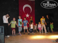 В Турции отдыхали первый раз. Ездили втроем с пятилетним сыном. Об отеле: очень уютный, чистый, красивый, зеленый, прям все по-домашнему)))) Все под боком: баня, сауна, ресторан, бассейн. В номере уборка ежедневная, полотенца меняли каждый день, красиво складывали (даже в туалете). В холле очень много удобных диванов и кресел, а вокруг всякая прикольная растительность. Пляж находится в двух минутах ходьбы от отеля. Маленький, но всем места хватает. Самое главное, что через дорогу переходить не нужно. Короткая прогулка после завтрака или обеда никому не помешает. О питании: Все вкусненько, разнообразненько. Много овощей, вареных, тушеных, свежих. Из мяса курица, индейка, баранина. Еще рыба во всяких видах. И всякие там сосиски и колбаски. Гарнир не повторялся, каждый день разный. Сладости божественные))))))))))) Фруктов не много: апельсины, грейпфруты, яблоки, дыньки иногда. О сервисе: Анимация отличная, дружелюбная, приветливая. Не проходят мимо ребенка не потрепав его за щечки, не спросив как дела (насылсыныс))) Каждый вечер детская дискотека, на которой детки отрывались по-полной. Для взрослых разные конкурсы с призами и подарками, вечером дискотека. И днем не давали скучать. На пляже обязательно волейбол, у бассейна дартс, стрельба из ружья, аквааробика и просто гимнастика, разные веселые игры. Перед обедом зажигательный танец у бассейна. Официанты вежливые, всегда пожелают "приятный аппетит". Аниматор Бора самый главный по-видимому. Умеет зажечь даже самых скучных людей, на его шоу улыбка с лица не сходит. Застали турецкую ночь, СУПЕР !!!!!! Обжераловка)))) Огненное шоу которое проводил Бора незабываемое, он большой молодец!!!, танцы живота и все такое.... В детского аниматора Сюзанну влюбились все детки. С 10 до 17 часов каждый день работал мини-клуб, где Сюзанна их развлекала. Короче плакала всю дорогу домой (4 часа лету до Перми) так грустно было, и жалко прощаться с отелем и с персоналом. Клевый отдых!!!! Рекомендую молодым семейным парам с детьми.