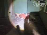 В главный корпус я влезла без проблем и меня поглотила нереальная атмосфера... Любопытство, смешанное со страхом потащило меня по лестницам на верхние этажи здания. На лестничных пролетах ходить надо очень аккуратно, некоторые марши не защищены ничем. Кромешная тьма, пронзаемая ярким лучом фонаря, проникла в самый мозг.... Нереальную, какую-то вакуумную тишину нарушали мои шаги и стук сердца. Мне кажется, что я там даже разучилась дышать.... На каком то из этажей я пошла по темному коридору и в луч фонаря попала лежащая фигура...в тот момент я вспомнила все молитвы и едва не выронила фонарь. Но нашла в себе силы подойти к фигуре. Это оказался манекен животного, у которого оторвали все конечности и голову.... Дальше я пошла бродить по номерам. Номера в отеле были невероятно уютными! Во многих сохранились шкафы, зеркала, раковины, унитазы. Очень красивый дизайн на стенах - цветы, обрамляющие зеркало, как свидетельство былой роскоши... Осмотр главного корпуса занял тоже довольно много времени. Из-за темных лестниц страху я натерпелась конкретно, поэтому взяв остатки смелости в кулак, снова вернулась на лестницы и поскакала вниз, на волю. Выйдя из корпуса поняла, что энергетика здания почему то тяжёлая, несмотря на красивую архитектуру. Над этим надо ещё подумать, почему это так.....