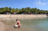 Пляжей у отеля два, подчеркну ИМЕННО ПЛЯЖЕЙ, а не вход в море, и оба пляжа хорошо сделаны, хороший песок, много лежаков и много тени. А вот вход в море не обустроен, на старом пляже мы видели купающихся во время прилива, но там по колено и мы там не купались. Около нового пляжа есть вход в море, но по-моему он не доделан, хотя мы там купались несколько раз. Там заводь, волн нет и дно заилено, но плавать можно и вода хорошо прогревается. Мы оставили в книге отзывов отеля пожелание к администрации, чтобы доделали там вход в море. Несколько раз ходили на дальний пляж кондотеля за плату (по 60 К с человека), он вообще очень хороший, ухоженный, много тени, лежаков и шезлонгов. Однако, лежаки в плотной тени надо занимать пораньше. Идти туда от нашего номера до дальних лежаков полтора километра, утром их проходили легко, возвращались око двух часов, это уже жарко, но можно выбирать дорогу по тенечку, тогда ничего. Зато дорога интересная: два живописных мостика, сказочная голубятня, огромные грибы с кузнечиками на шляпках, домики-пни по пути (дети сказали, что там можно играть в «Алису в стране чудес»). По пути можно посмотреть павлинов и оленей. Около входа на пляже продаются фрукты и мороженное. Когда мы ходили на этот пляж, то делали там массаж и обедали в том ресторане (нам показалось, что там дешевле, чем в нашем отеле).