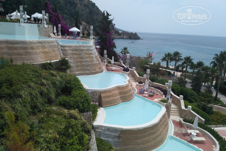 Шикарные виды открываются с терасс бассейнов в виде Памуккале, хотя и с территории пляжа вид отличный.