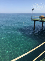 Пляж. Широкий и длинный, лежаков всем хватает. Средняя и мелкая галька. Входить в воду можно без специальной обуви. Но есть и металлическое приспособление для входа. Вода в море невероятно чистая и прозрачная! Есть небольшой пирс, на пирсе лавочки, спуски в воду. Лежаки, тенты – все в наличии. Наше любимое место на лежаках – это на зеленой поляне рядом с пляжем, в тени пальм и эвкалиптов, вот где рай.