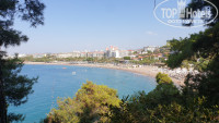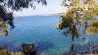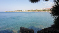 Слева от пляжа находится мыс с растущими на нем акациями и соснами. Можно прогуляться по этому мысу, с него открываются красивые виды во все стороны горизонта. С нашего пляжа довольно удобно плавать к этому мысу и вдоль него. С одной стороны это безопасно (нет яхт), с другой интересно так как плавание к буйкам и обратно быстро надоедает. К мысу часто подходят прогулочные яхты или яхты для дайвинга. Мне кажется, что для дайвинга здесь не самое лучшее место, но яхты подходят регулярно по определенным дням недели. поэтому рыбы здесь есть, прикормлены, но с маской нырять не интересно, место здесь до обеда в тени и рыбы все какие-то блеклые. в общем, это не Красное море и нет никакого смысла заниматься здесь снорклингом.