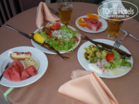 Еды там достаточно!Конечно без изысков,но голодать там икто не будет!)всегда овощи и фрукты(арбуз,дыня,апельсины),мясо только на обед и ужин,рыба тоже была на гриле.Ням-ням!)А какие десерты!!!!!!)думаю длинные очереди проголодавшихся туристов свидетельствуют о том что люди торопились отведать вкусненького. Бар конечо не фонтан))))пиво вот понравилось!