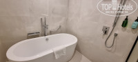Попали в этот отель по Фортуне. Останавливались в номере Делюкс. Свежий, просторный. В номере душ, ванна, большой ТВ (1 русский канал), огромная кровать, чайник (чай+кофе+сахар), бесплатный сейф, бутылка воды 0,5л на каждого ежедневно, халаты+тапочки. Балкона нет.