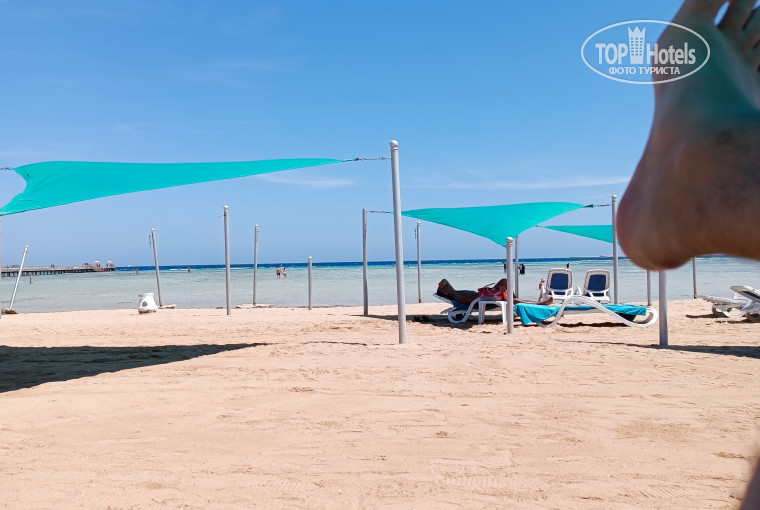 У отеля обширная собственная береговая линия с песчаным пляжем, баром, туалетами, душем. Есть набережная и променад протяженностью около 10 км, по которому можно вечером погулять и прокатиться на прокатных электромобилях(20$ час) . У отеля свой коралловый риф(шикарнейший для хургады) . В основном все плавают в бухте, окружённый старым рифом, и помимо этого если идти до конца пирса можно поплавать над живым рифом, рыб очень много.