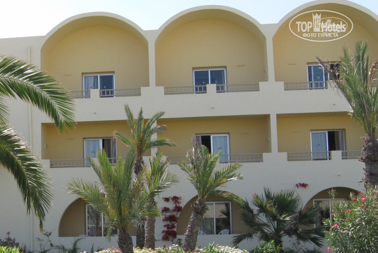 Были в этом отеле на майских праздниках.На Джербе разница с Москвой 3 часа.Было жарко, но ветренно, так как еще не сезон))) Море и песок на острове просто сказочные,как на открытках. Отель для 4* суперский. В восточном стиле и имел самое высокое здание высотой в 3 этажа)) В отеле есть как номера, так и бунгало. У нас был номер и мы были рады,что не бунгало. Потому что многие бунгало постороены так, что хочется с улицы сразу зайти в номер,через балкон, который на уровне земли)) Но все это мелочи. В общем отель классный. очень много бассейнов, так что места хватит всем, но самое главное в отеле есть аквапарк для взрослых и детей. Для детей особое внимание, для них очень много всего сделано: уличной городок с горками и домиками, есть комнаты где аниматоры с ними рисуют, играют,а по вечерам детская анимация. Для взрослых всё ещё более интересней. В отеле голодным никогда не останешься, так как там один главный ресторан и 3 a-la-carte(с туниской,тайской и средиземноморской кухней) и бесконечными перкусами целый день и даже на пляже. Еда суперская,все очень вкусное. В главном ресторане всегда были тематически ужины (французской,итальянской кухни и т.д.).Все готовится прямо в ресторане и ты сам себе выбираешь с чем тебе пожарить рыбу или мясо. Всегда были морепродукты: королевские креветки,мидии,крабовое мясо,осьминоги и много разнообразной рыбы.Очень богатый выбор фруктов, мы вдоволь отъелись клубники,а также были арбузы, дыни, финики, персики, некторины, сливы, бананы)) А уж от сладкого глаза разбегались)) Так что очень долго не могли определиться, что съесть: 5 видов тортиков или то мусы с фруктами, или то и другое. Так же там мы отъелись обалденным мороженным, его давали на обед и ужин. Я налегала на фисташковое)) Еды очень много и даже привереды найдут себе вкусняшку. Неплохо иметь запасной желудок, а то в один все вкусности не влезают. Много баров,где можно заказать алкогольные коктейли,а в холле гостиницы вообще бар работает круглосуточно (это для особых персон,кто любит выпить покрепче в 5 утра:-) ). В отеле вечером всегда много живой музыки, в барах, в ресторанах и конечно же вечером. После анимаци под звездным небом все танцуют под живую музыку, а для тех кому и этого мало, в гостинице есть своя дискотека. В отеле есть чем заняться начиная от spa- процедур, спортзала, заканчивая уроками по гольфу, большому теннису, велопробегам. Пляж убирают каждый день, песочек беленький и суперское море. Аниматоры не дадут вам скучать, будут вас звать играть в футбол, воллейбол и разные игры на песке. Кому скучно валяться на шезлонге, то на пляже можно научиться кататься на видсерфинге и на парусном катамаране,так же можно кататься на банане и на канноэ (бесплатно!). Так что скучно не будет.Тут думаешь как все это попробывать)) вот бы на работе так летело время как на отдыхе. Так что отель суперский и подходит для тех кто не любит отдыхать с большим количеством русских)) Когда мы были, то руских всего 4 человека было)) За территорией отеля нечего делать, поблизости нет магазинов и кругом пустыня. Но на такси можно съездит в город Медун за 2 динара= 40 рублей (в одну сторону) за сувенирами)) На острове экскурсий практически нет, ну кроме крепости которую вы будете проезжать по дороге в отель из аэропорта и крокодиловая ферма)) Очень интересная экскурсия на материк в пустыню Сахара. Так что ед