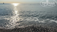 пляж находиться достаточно далеко от отеля, пешком минут 10 идти, для кого то это минус, но нам нравилось, так как пут ь шел как раз по той набережной, для нас минусом были мелкие камни, либо покупать специальную обувь, либо терпеть небольшой дискомфорт. на пляже есть свой бар с едой, различные пиццы, салаты, фрукты, мороженое приносят прямо к лежаку. так же курсирует микроавтобус с кондиционером. если прям лень идти можно сесть в него.