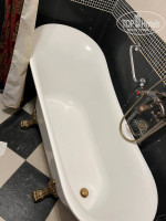 Номер огромный - 32 кв.м. Есть собственная ванна, стилизованный унитаз, обеденная зона, широкая кровать, телевизор, вода 1,5 л.