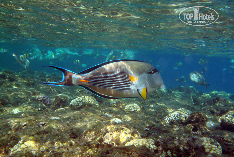 До моря идти не далеко, прогулочным шагом минут 8, на пляже лежак всегда можно найти, я проблем не наблюдал. Море шикарное, пляж так себе и о нем надо отдельно говорить, сразу скажу, что передвигаться по пляжу босиком неприятно и больно: камни, ракушечник, песок крупный, поэтому всем рекомендую приобрести тапочки с жесткой подошвой т.к. и в море надо заходить только в тапочках!!!!! Остерегайтесь рыбу-камень!!! Море интересное, есть прилив и отлив, очень много рыбок плавают прям около и рядом не боятся вас и не обращают на вас никакого внимания, дно каменистое коралловое, а у берега песочная 3-х метровая зона, в камнях кругом притаившееся ежи, поэтому если вы без тапочек и не дай бог нога соскочит и угодит под камушек к ежу, будет не очень приятно и испорченный отдых вам гарантирован!!!! НЕ БУДТЕ БЕСПЕЧНЫМИ!!!!!! С понтона удалось поплавать всего три раза в спокойной воде, а в основном большие волны всегда были и течение но удовольствие сумасшедшее, красотища! – коралловый риф, рыбок бессчету море чистейшее, прозрачное, а так….. плескались возле берега, воды по попу, можно и с маской поплавать на рыб полюбоваться, в кресле в воде посидеть о кренделях небесных помечтать, с дитем поиграть-позаниматься. В догонку к этому хочу посоветовать сходить\съездить на экскурсию на кораблике в РасМухаммет, очень интересная и занимательная экскурсия.