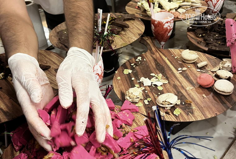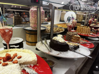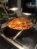 Отель нас поразил своим богатым разнообразием предлагаемой еды. Ну, голодным тут никто не останется!!! Рыба была каждый день- очень вкусная, потому, что свежая, мидии и кальмары. Овощей и фруктов вдоволь!!! Булочек огромное количество и разнообразие, рахат-лукум оооочень вкусный! Множество видов сыров, оливок и маслин, различные заправки. Картошка всегда в нескольких вариантах: фри, пюре, вареная, печеная, так же, как и курица: жареная, вареная, в соусе. Пасту делают прям при тебе: набираешь тарелку спагетти со всем что тебе хочется и на огне тебе все обжаривают с соусами и сыром. Супчики всегда в двух вариантах. С утра есть каши, омлет, глазунья, жарят тосты, вафли. Из мяса была говядина, язык. Фастфуд: гамбургеры, фри, картошка по деревенски. Сладостей , пирожных и тортиков огромное множество и всё очень вкусное! Мороженое, коктейли делают очень красивые и качественные, барная карта также очень разнообразна и вина и шампанское и крепкие напитки.