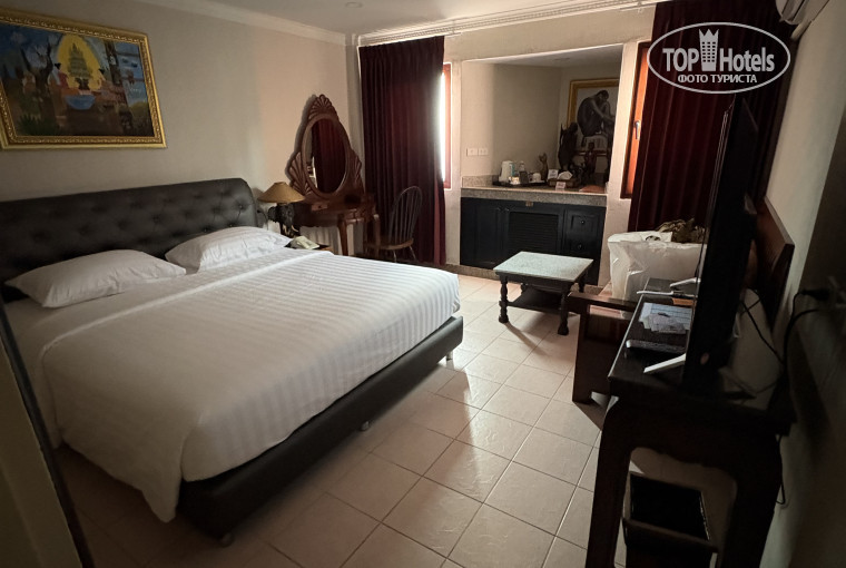 Вполне неплохой вариант для размещения в самом центре Паттайи. Рядом с Волкин Стрит. Между пляжной улицей и второй улицей. Не большой, компактный и уютный отельчик. Проживал в номере Де-люкс. Просторный (в р-не 30м2). Наполнение номера - все необходимое и в приличном состоянии. По уровню, можно сказать, что вполне приличная тройка. Кстати и сервис бронирования выдает этот отель как 3 звезды. Почему тут две, не известно...