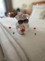 Приехали в отель в 9 утра,сразу же надели браслеты,пригласили на завтрак,дали карточки для полотенец. Номер получили в 12:30, могли и раньше дать,но так как мы писали про возможность улучшения номера поближе к пляжу (в связи с проблемами по здоровью), нам дали чуть позже,но,бесплатно,получили номер с видом на главный бассейн и море. Да,номера не новые, видно,что подуставшие,но,проблем не было ни с чем, сантехника рабочая,вода горячая,холодная,все есть. Большая двухспальная кровать, кондиционер работал,шумоизоляция более менее,соседей не было слышно. В мини баре только вода, остальное за деньги. Насчёт воды - она есть везде, в любом количестве,в бутылках по 0.5.