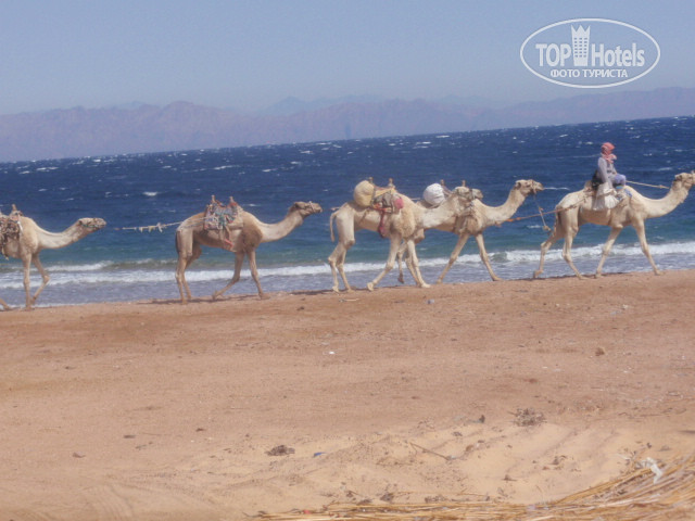 а анимация - она здесь есть, и представлена в виде экзотических синайских гор, красочного и никогда не надоедающего красного моря, вечерних огней Иордании, звезд, пения птиц и запаха цветов. Возле берега можно видеть не загорающие телеса соотечественников, бьющихся за лежаки, а крабов, цапель, серых и белых, и верблюдов мычащих и важно жующих. Можно даже не умеющим плавать, увидеть великолепный риф - с мостика или осторожно, чтобы е наступить на экзотическую морскую зверушку, с берега зайти в море опустить голову в маске и наслаждаться бесплатно, самостоятельно и в любое время дня тем, что предлагается в других отелях за деньги, с инструкторами или каким-то там прозрачным дном..... А можно просто купаться, сколько влезет, и не раздражаться скрипом катеров (Их здесь нет совсем)!!!, бензином, поп музыкой.