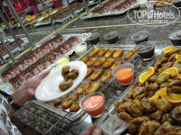 Отдельное спасибо поварам. Такого разнообразия и вкуснейшей еды не видела и не пробовала.Всегда свежие овощи в нарезке и для салатов. Несколько видов заправок для салатов, зелень. Мясо каждый день и не в виде соевых котлет, как пишут в отзывах об некоторых отелях. Фрукты: яблоки, апельсины, груши, реже клубника. Все просто не перечислить. А какая выпечка!Ум отъесть! На завтрак к булочкам масло, мед, сыр, джемы. Кто- то посетовал на скудность чая, то в баре я насчитала 5 видов (в пакетиках) и очень вкусные, кофе- 3 вида.