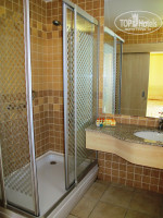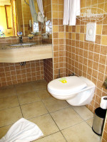 Санузел совмещённый. У меня была душевая кабина - всё изолировано, никаких мокрых полов вокруг после водных процедур. Рядом с раковиной обнаружили кучу всяких флакончиков (гель для душа, шампунь и лосьон для тела) и коробочек (мыло, шапочка для душа, санитарные пакеты, ватные диски и палочки для ушей). Висел фен (как работает – не знаю, не пользовалась). Пол в номере - кафель, так что обязательно возьмите с собой тапочки (или тёплые носки), если Вы не любитель ледяных ног.