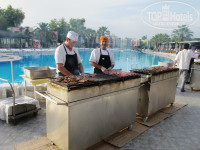 Набор блюд достаточно разнообразный, хотя и повторяющийся. Утром: яйца во всех вариантах (вкрутую, всмятку, омлет, яичница), огурцы-помидоры, оливки, немного тушёных овощей, блинчики + молочные продукты (каша, йогурты, сыры). На обед и ужин всегда были мясо (в основном, птицы, но бывала и говядина с бараниной – кусочками или в виде котлет/люля/тефтелей) и рыба. Естественно, куча всяческих салатов, гарниров и овощей. Периодически мясо жарили на улице, хотя никаких тематических ужинов нет (ни рыбных дней, ни турецких вечеров, ни чего-нибудь подобного). Правда, два раза натягивали в ресторане красно-белые ленты и вешали турецкие флаги, но ассортимент блюд при этом, как мне показалось, не менялся.