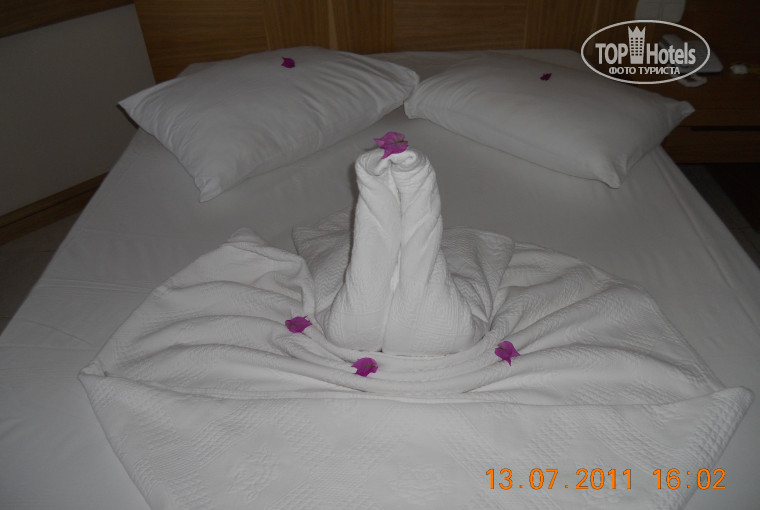 Мы ездили в июле месяце и остались в полнейшем восторге, даже после того как нас в 1-й день заселили в номер 1237 (одноместный, повернуться негде, в ванной шторку задницей задеваешь, телевизор к кровати ближе чем на пол метра, вид из окна на пожарную лестницу)!!! Потом на ресепшене нам без проблем поменяли номер на 2319, 2+1, большой, ухоженный. Вообще все номера с балконами. Каждый день крутили лебедей)Я была в Турции в третий раз и по сравнению с другими отелями (Кесдери, Грин Хилл) питание намного разнообразнее, больше мясных продуктов, напитков.