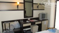Номер расположен на третьем этаже. Имеется лифт, но мы поднимались пешком - так быстрее (если кто-то вызывал лифт на нулевой этаж, он забирал попутчиков, а потом уже двигался по назначению). В номере двуспальная кровать, диванчик, кондиционер, холодильник, телевизор (русскоязычных каналов насчитали 3, остальные - турецкий, немецкие, польские). Кондиционер немного шумел, но мне лично это нисколько не мешало, как живущей у оживленной дороги. Однако заметили, что он каким-то образом отключается ночью. Думаем, что по ночам происходит кратковременное отключение электричества.