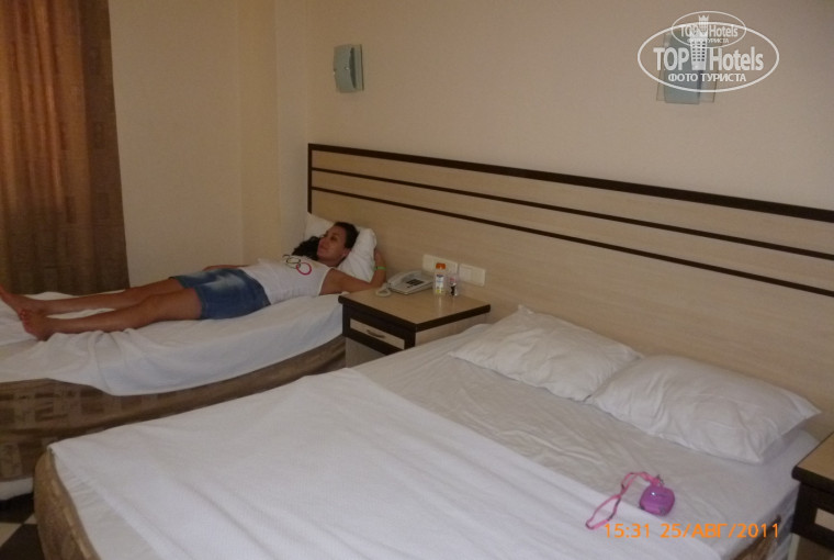 Отдыхала в период с 24 августа по 1 сентября. В целом очень хорошее впечатление, очень не хотелось уезжать. Приехали мы с подругой вечером, нас сразу отвели в номер. Вида из окна вообще никакого небыло, просто стена. Не долго думая,, за 10 дол. договорились на другой номер в хорошем блоке, мы остались довольны. В номере: холодильник, фен, кондиционер, ТВ, хол/гор. вода постоянно. На первом этаже куллер с питьевой водой. Питание хорошее, для мужчин которые не могут без мяса могут сходить в кафешку по пути на пляж, там где продают сок и мороженое (большие порции и очень вкусно!). По поводу экскурсий можете смело покупить на улице, т.к. то что говорят наши гиды-это полный бред. Мы брали у Миши (Хиро тур). Ну вы его точно встретите если будете отдыхать в Марине))) Для молодежи в Бельдиби есть дискотека Jest, минут 10 ходьбы от отеля. Пряж галечный, я покупала специальные тапочки за 3 дол. в них удобней заходить в воду. Есть дикий пляж минут 20 ходьбы в сторону Антальи, там уже песочек и галька помельче. Не буду много писать, езжайте, не пожалеете!!!