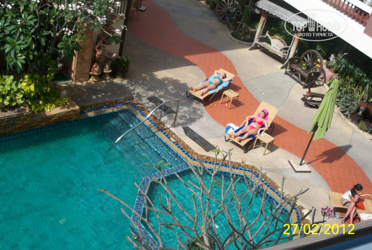 Недалеко от отеля есть вечерний рынок, где можно купить много всяких местных фруктов, в 3-4 раза дешевле, чем на набережной. Также вечером приезжают местные передвижные лавочки с всевозможными тайскими блюдами. Жарят, пекут - вообщем все можно попробовать начиная от супчиков, заканчивая ракушками и насекомыми, причем очень дешево. Одна порция в пределах 30Бат. Это уже чисто местная кухня, для тех кто захочет окунуться в местный колорит, для тех кто не рискует с питанием, можно найти и вполне привычную пищу. Также недалеко от отеля остановка для посещения ночного рынка Паттайи по выходным. Там много дешевых летних вещей и есть базар, где также много чего можно попробовать экзотического. Вообщем-то расположение отеля удобное для проживания и отдыха. Персонал следит за порядком и поведением гостей. Шуметь сильно не позволяют. Для этого лучше выбрать какой-либо бар на набережной или Волкинге. Будет даже намного интересней. В отеле люди отдыхают спокойно. Нам такая постановка понравилась, так как после экскурсий или посещений дискотек и различных шоу хочется спокойно отдохнуть, чтобы на следующий день были силы для новых приключений.