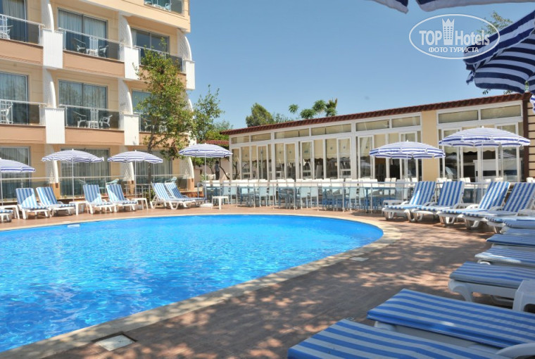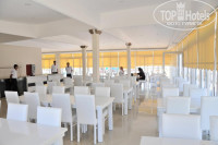 Нет информации о времени создания фото. На фото открывшегося неделю назад отеля в ресторане всего лишь одна пара принимает пищу. На пляже нет людей. В бассейне нет людей. На каждом балконе одинаково, как в армейской казарме ровненько стоят стульчики. Лишь на одном балконе основного корпуса висит полотенце. Возможно только один номер пока занят в отеле (той парой, что романтично кушает на фото)...
